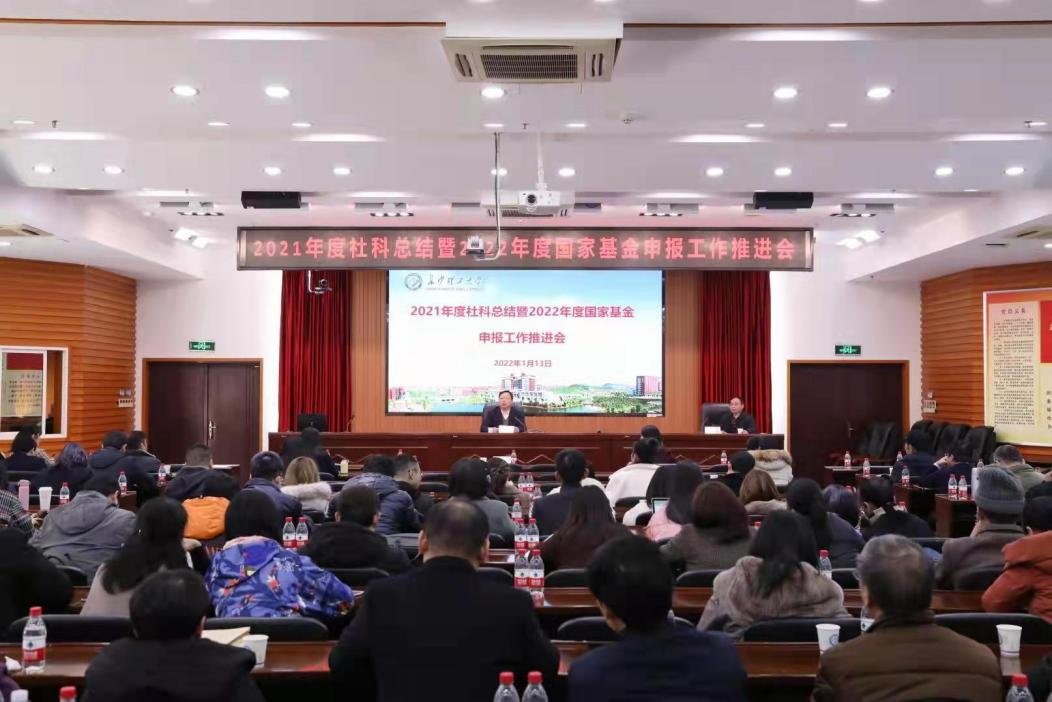 1月13日下午,世界杯官网2021年度社科总结暨2022年度国家基金申报工作推进会在一办九楼会议室举行。副校长曾祥君出席会议并讲话,社科处处长刘建江主持会议。各文科学院院长、科研副院长、科研主任及教师代表等120余人参加会议。