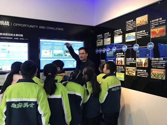 邓斌带领学生们参观实验室、进行了科普讲座,通过生动的视频向他们展示了美丽的洞庭湖和在洞庭湖区生活的江豚、麋鹿等珍惜保护动物,并解释了环境污染与破坏对它们可能造成的伤害和不利影响,进而告诉他们为什么要建立洞庭湖实验室,实验室能为我们保护洞庭湖环境贡献什么力量。科普讲座期间,学生们发言积极、思维活跃,在一问一答的互动中,对洞庭湖有了更进一步的了解,也对不乱扔垃圾、爱护环境、保护母亲湖有了更深刻的认识。