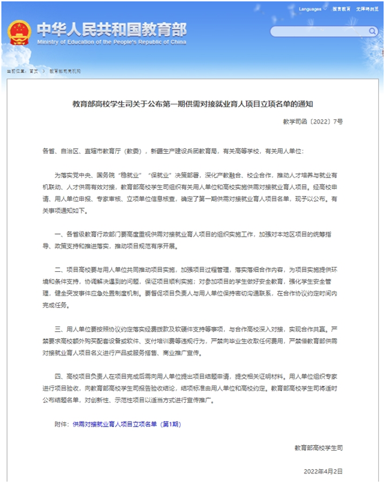 近日,教育部高校学生司下发《教育部高校学生司关于公布第一期供需对接就业育人项目立项名单的通知》(教学司函〔2022〕7号)文件,公布了全国第一期供需对接就业育人项目名单,我院孙士权副教授牵头主持的《北控水务集团—在线买世界杯平台智慧水务就业实习基地项目》(编号:20220105880)成功获批。