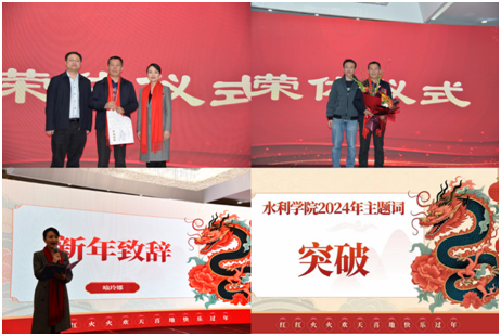 大会同时举行了退休教师荣休仪式。院党委书记喻玲娜、院长陈杰为退休教师颁发荣休证书和荣休水晶杯。院党委书记喻玲娜致新年致辞,期望水利学院在2024年各方面实现新的突破。