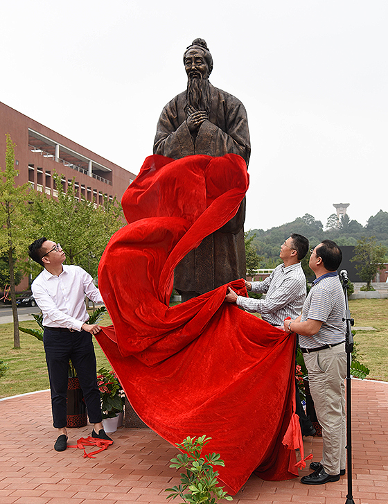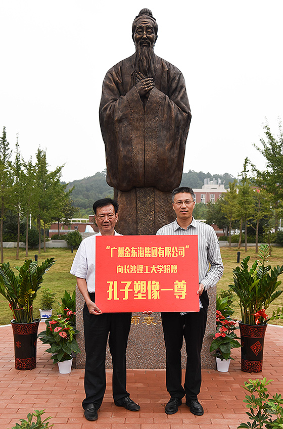 随后,广东金东海集团副总裁林辉进、副总裁周德昌和副校长蒋昌波共同为孔子像揭幕,并由蒋昌波为广东金东海集团授予捐赠证书。
