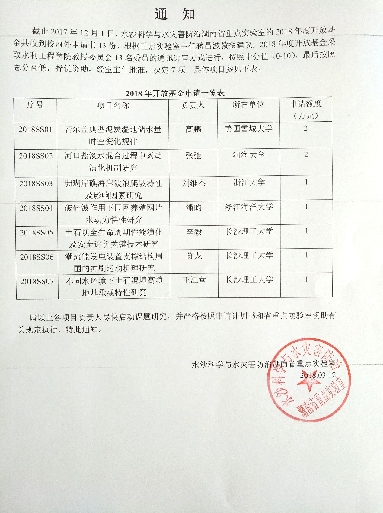 2018年水沙科学与水灾害防治湖南省重点实验室开放基金申请一览表