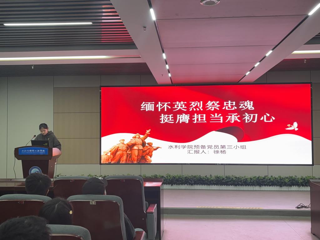 分享环节中,各小组代表依次上台展示实践成果,内容涵盖党史宣讲、社会实践、志愿服务等多个领域,既有扎实的实践总结,也有可复制的经验分享。预备党员第一组结合参观党史展览馆的廉洁教育实践,系统解析了活动策划与执行的全过程,并分享了手持云台使用、拍摄机位选择等宣传实操技巧,为同类活动的影像记录提供了有益参考;发展对象第五组针对水利新生面临的学业与就业困惑,为130名新生打造专属指导平台,切实助力新生适应大学生活;预备党员第二组代表万佳怡、第三组代表徐杨分别分享了前往中小学开展红色宣讲的经历,其中徐杨团队创新推出“人生模拟器”沉浸式体验活动,引导青少年在情境互动中感知历史、传承革命精神,实现了红色教育的生动转化;发展对象第四组则致力于构建跨年级交流机制,打破年级之间的信息壁垒,促进学生经验与资源的持续流动。