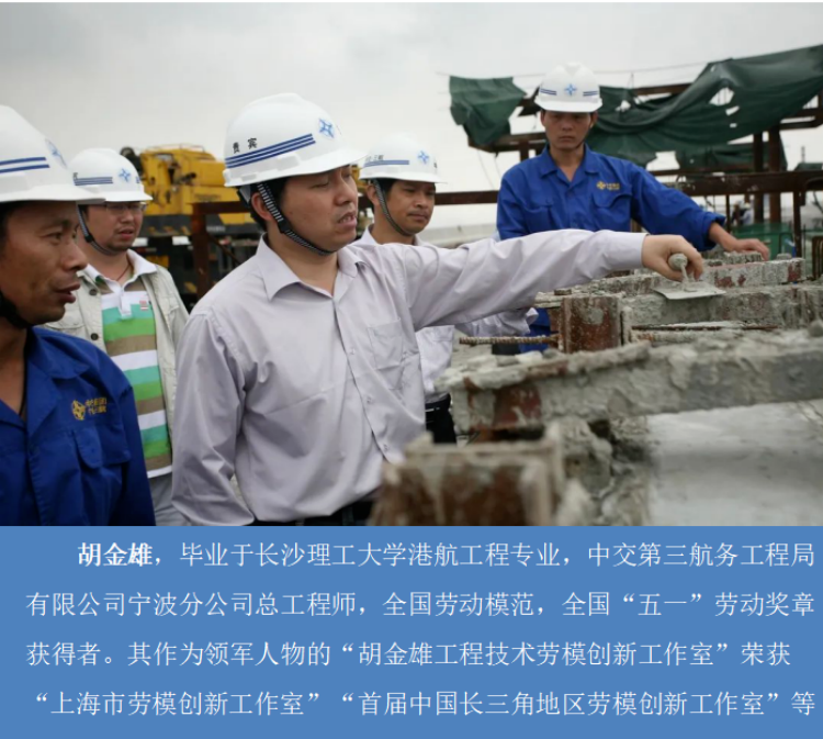 胡金雄,毕业于在线买世界杯平台港航工程专业,中交第三航务工程局有限公司宁波分公司总工程师,全国劳动模范,全国“五一”劳动奖章获得者。其作为领军人物的“胡金雄工程技术劳模创新工作室”荣获“上海市劳模创新工作室”“首届中国长三角地区劳模创新工作室”等