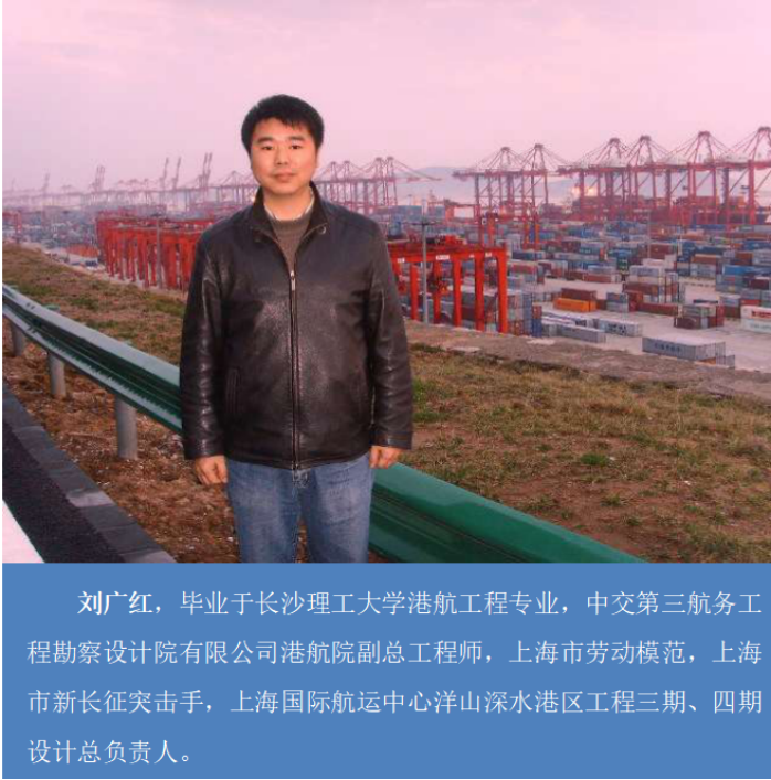 刘广红,毕业于在线买世界杯平台港航工程专业。中交第三航务工程勘察设计院有限公司港航院副总工程师,上海市劳动模范,上海市新长征突击手,上海国际航运中心洋山深水港区工程三期、四期设计总负责人。