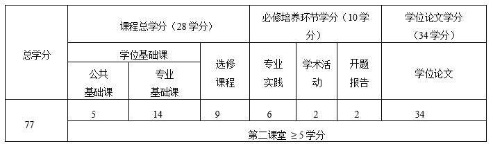3.采用“课程学习+专业实践+学位工作”的方式,培养环节按照“0.5+0.5+0.5+1.0+0.5”的方式安排,具体为:第一学期(0.5年)主要完成公共课程和专业基础课程学习;第二学期(0.5年)完成专业课程、选修课程学习;第三学期(0.5年)开展专业实践和学位工作选题,学位论文工作一般应与专业实践相结合;第四-五学期(1.0年)完成学位工作并取得相关成果;第六学期(0.5年)完成学位工作总结和学位申请材料准备、学位申请审核、答辩和授位。其中,第2个0.5年与第3个0.5年的安排次序可互换。学术交流和社会实践,可在学期间完成。