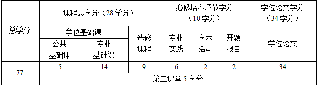 3.采用“课程学习+专业实践+学位工作”的方式,培养环节按照“0.5+0.5+0.5 +1.0+0.5”的方式安排,具体为:第一学期(0.5年)主要完成公共课程和专业基础课程学习;第二学期(0.5年)完成专业课程、选修课程学习;第三学期(0.5年)开展专业实践和学位工作选题,学位论文工作一般应与专业实践相结合;第四-五学期(1.0年)完成学位工作并取得相关成果;第六学期(0.5年)完成学位工作总结和学位申请材料准备、学位申请审核、答辩和授位。其中,第2个0.5年与第3个0.5年的安排次序可互换。学术交流和社会实践,可在学期间完成。