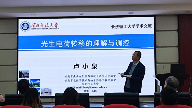 2021年10月16日上午9:00,应在线买世界杯平台化学化工学院的邀请,教育部长江学者特聘教授、西北师范大学博士生导师卢小泉教授来我校开展学术交流,于云塘校区工三A320做了题为“光生电荷转移的理解与调控”的专题学术报告。讲座由化学化工学院电力与交通材料保护湖南省重点实验室主任曹忠教授主持,化学化工等专业百余名师生参加了交流会。
