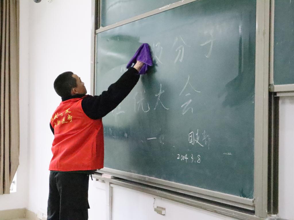 活动中,志愿者们重点对教室、走廊及卫生死角进行清扫。虽然天气还未回暖,但大家干劲十足,各司其职,相互配合,认真细致地打扫每个角落,使公共环境重现往日整洁。与此同时,还有一组志愿者在认真地将自己对雷锋精神的理解描绘于黑板之上,为践行雷锋精神营造浓厚氛围。