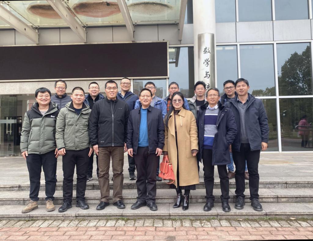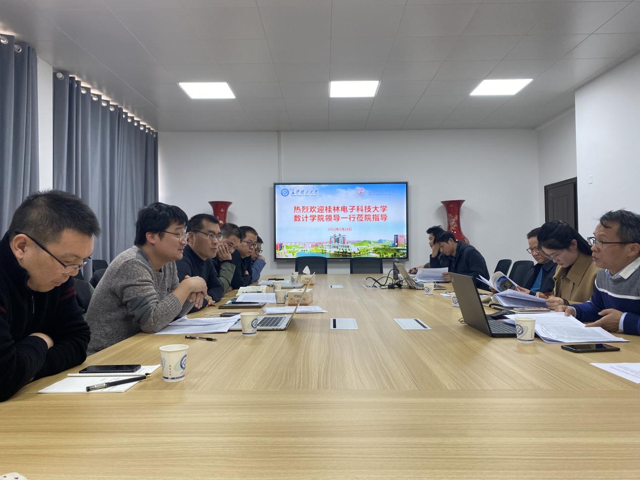 鉴于我院近几年在专业建设、人才培养、课程建设、公共数学教学、学科竞赛等方面取得显著成效, 2023年2月24日上午,桂林电子科技大学数计学院副院长吴孙勇带领考察组赴我院交流调研。为进一步完善两院人才培养方案、公共数学改革,提升教学管理水平,我院党委书记邓崛峰、党委副书记郑忠辉、副院长仝青山、副院长李姣率领系(部)负责人与以吴孙勇副院长为首的代表团于在线买世界杯平台理科楼A-410召开交流调研会议。
