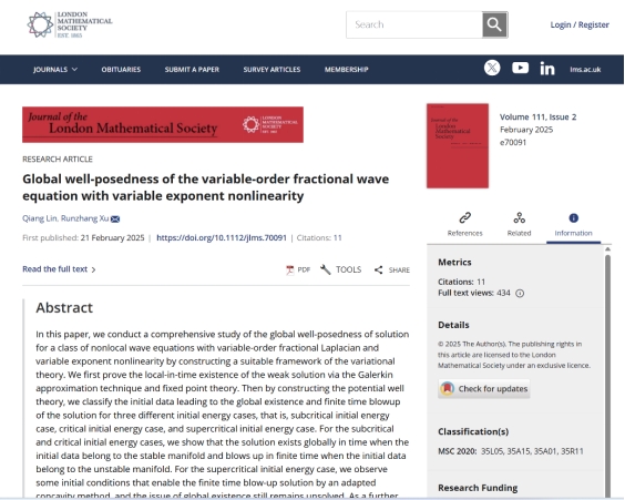 近期,我院青年教师林强在国际数学权威期刊Journal of the London Mathematical Society上发表题为Global well-posedness of the variable-order fractional wave equation with variable exponent nonlinearity”的研究成果。
