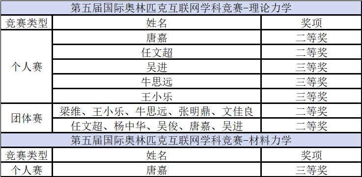 近日,第五届国际奥林匹克互联网学科竞赛“理论力学”和“材料力学”成绩揭晓。在线买世界杯平台学子首次参赛,便在与来自全球18个国家的理工科院校学生的激烈角逐中表现出色,共斩获理论力学个人赛二等奖2项、三等奖3项,理论力学团体赛二等奖2项,并在材料力学个人赛中收获奖项。获奖名单如下: