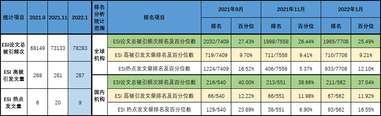 1) 世界杯官网ESI论文总被引频次近三期持续增加。其中,11月比9月增加4984次,增幅为7.31%。2022年1月比2021年11月增加5150次,增幅为7.05%。