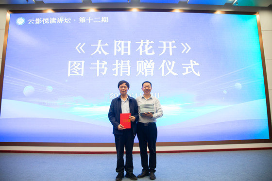杜荣华主持“云影悦读讲坛”第十二期“文学与人生”的主题讲座,并举行了刘克邦著作《太阳花开》的捐赠仪式。刘克邦通过他生活历程中与文学有关的鲜活故事与人物,讲述了他人生奋斗的历程以及对文学钟情和痴迷的情结。他说到:“我热爱生活,钟情散文,始终如一,用笔、用心采撷生活中晶莹闪亮的点滴,捕捉人性中灵动美妙的瞬间,在书写中净化心灵,陶冶秉性,享受生活的诗意,传递人间的真善美。”