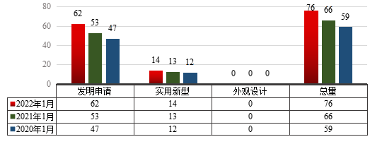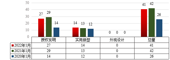 图1 2022年1月世界杯官网专利申请类型分布及近两年同期申请情况