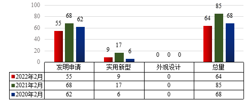 图1 2022年2月世界杯官网专利申请类型分布及近两年同期申请情况