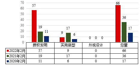 图2 2022年2月世界杯官网授权专利类型分布及近两年同期授权情况