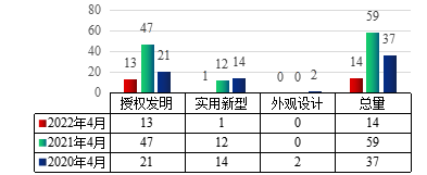 图2 2022年4月世界杯官网授权专利类型分布及近两年同期授权情况
