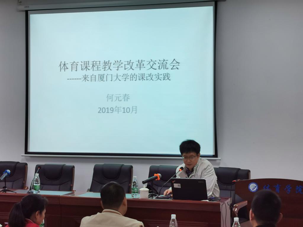 何元春教授从《体育课程教学改革交流会---厦门大学的课改实践》说起,跟大家一起畅谈了厦门大学在体育教学实施过程中一些具体做法及经验。他从课程设置、选课、开课方式、师资配备、开课效果、场馆设施、体质健康测试等方面,深入浅出地阐述了大学体育在助力提升人才培养质量的重要性和必要性,并一起观看了他们教学、群体运动、高水平运动队的精彩图片,为我们全方位了解国内一流高水平大学体育课程的教学,拓宽了视野,借鉴了宝贵的经验。