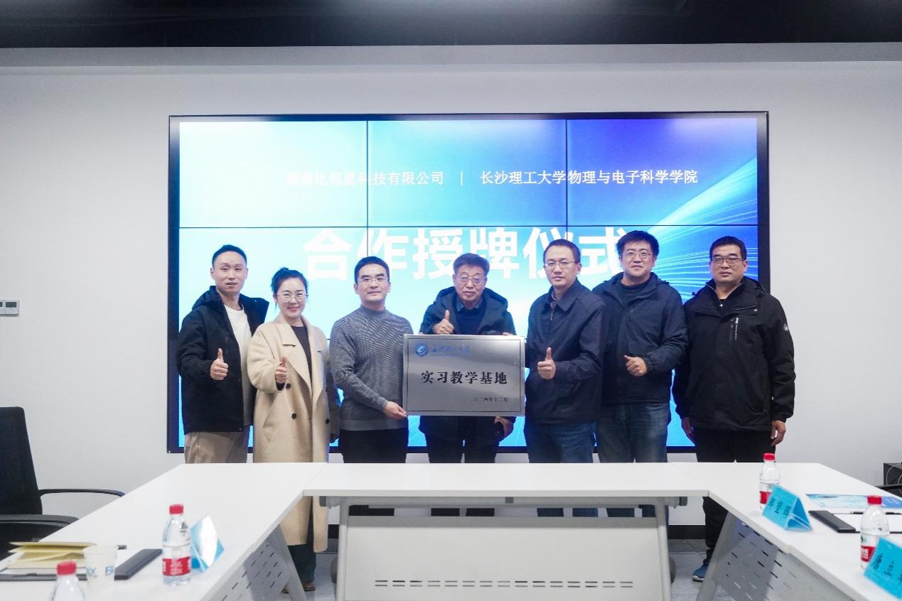 12月18日下午,物电学院团队首先来到了湖南比邻星科技有限公司。该公司主要为智能制造、智慧教育、智慧交通等行业提供智能机器人系列产品及行业整体解决方案。在比邻星科技,学院团队受到了公司创始人、总经理周博文教授等高层的热情接待。周博文教授亲自带领团队参观了公司,并详细介绍了公司的发展理念和产品。在座谈会上,双方针对教育教学、人才培养等方面进行了深入探讨,并表达了进一步开展深度合作的强烈意愿。随后,双方签署了实习教育基地协议,并举行了实习教育基地授牌仪式。