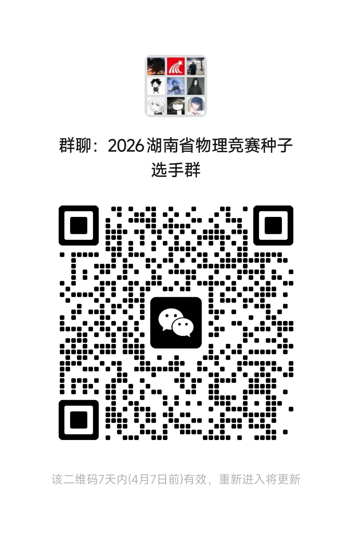 请竞赛获奖同学以及有意向参加省赛的同学加入湖南省物理竞赛群聊(群聊二维码见本通知)。