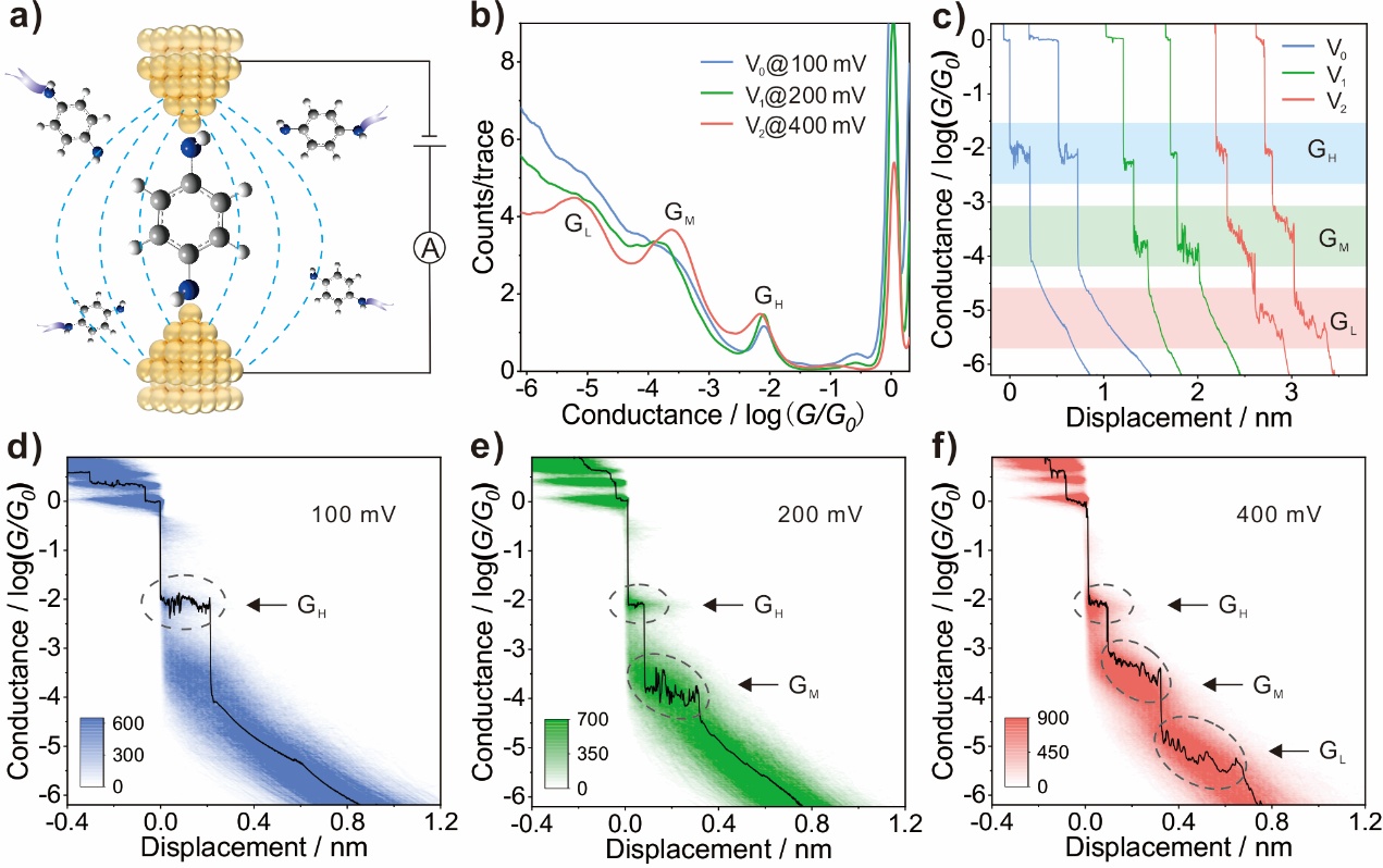 本研究工作利用扫描隧道显微镜裂结 (STM-BJ) 技术,深入探究了对苯二胺 (PPD) 分子在纳米电极间的电荷传输行为。研究发现PPD分子的电导状态并非一成不变,而是随外加偏压的不断增加下稳定地呈现出三种清晰且稳定的状态(图1)——高电导态 (GH)、中电导态 (GM)、低电导态 (GL),开关比 (GH/GL) 高达~1200。