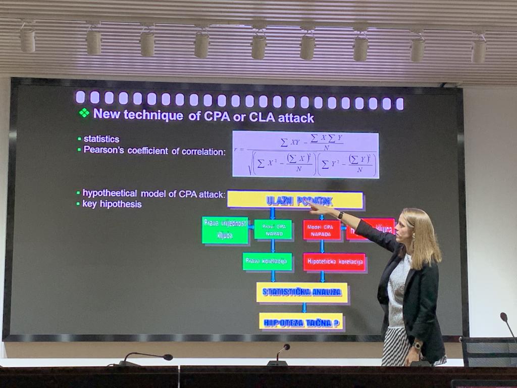 Milena Djukanovic 教授先对黑山大学的现状及历史进行了简单介绍,之后做了题为Side-channel attacks on hardware of smart cards and their countermeasures的学术报告。从信息的出现,到信息传递,再到基于信息保密的必要出现的编码和解码技术。接着是讲到了现今网络中的信息传递可能遇到的攻击及防御。由浅入深的介绍了在信息网络这个没有硝烟的战场上的战斗。