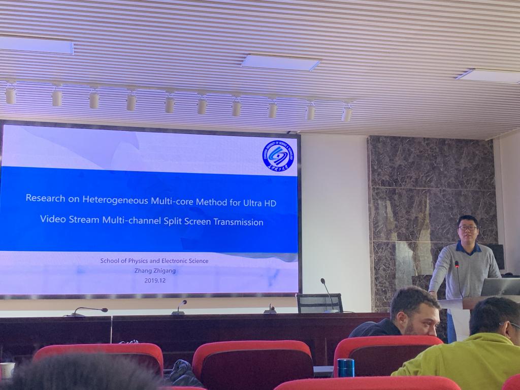 第三位做报告的是我院在读博士研究生——张志刚,他进行了题为Research on Heterogeneous Multi-core Method for Ultra HD Video Stream Multi-channel Split Screen Transmission的学术报告。从当今人们对于视频显示的更大更高清的需求出发,提出他们课题组欲将视频数据分块传输至多块高清屏幕以维持图像的高清晰度,通过多块屏幕组合成大屏幕这一设想。