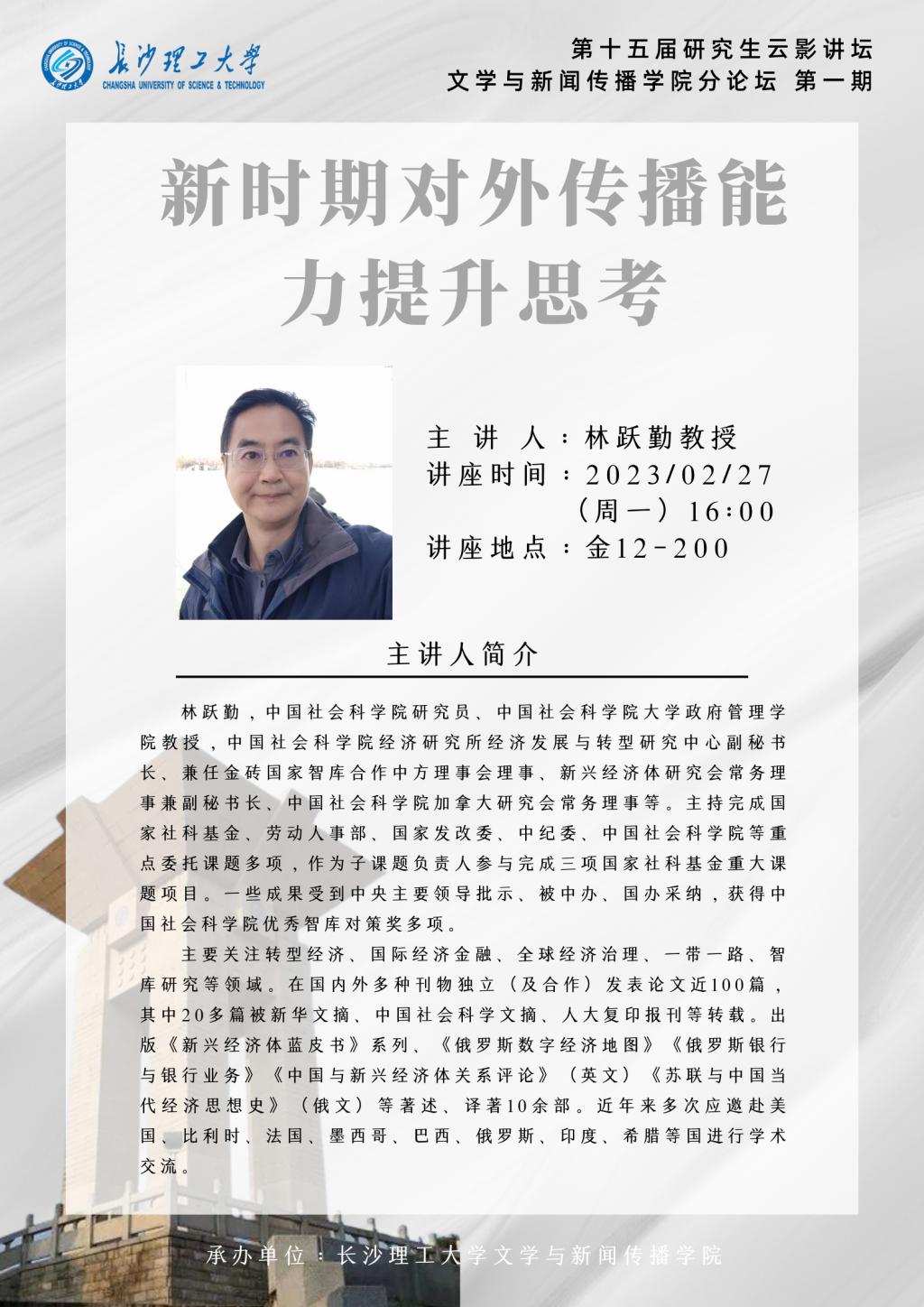 2023年2月27日下午,在在线买世界杯平台金盆岭校区12号教学楼内,第十五届研究生云影讲坛文新学院分论坛第一期如约进行。本次讲座邀请中国社会科学院研究院林跃勤教授为学生们讲授主题为“新时期对外传播能力提升思考”的讲座。