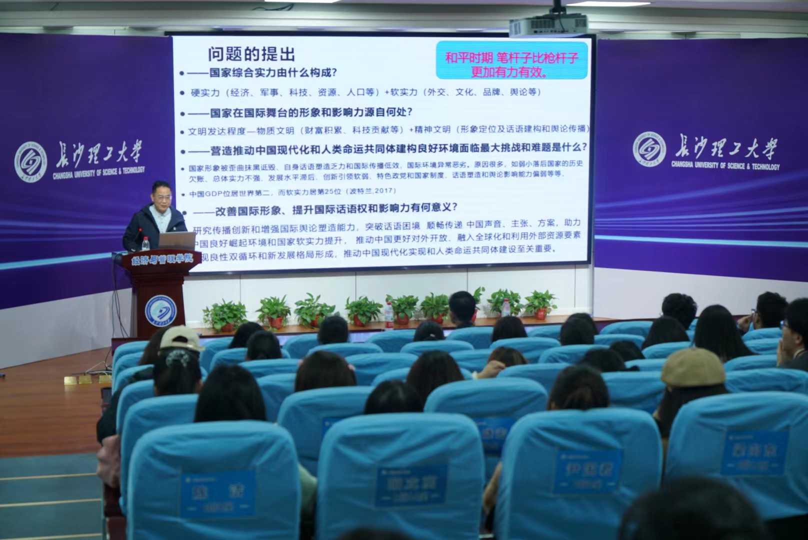 讲座伊始,林跃勤教授通过对当前国际形势的分析,引出“国家综合实力由什么构成?国家在国际舞台的形象和影响力源于何处?改善国际形象、提升国际话语权和影响力有何意义?”等四个问题。重点围绕国际传播能力展开论述。并将国际传播能力基本构成分为机制政策保障、媒体机构实力、传播影响力三个部分。