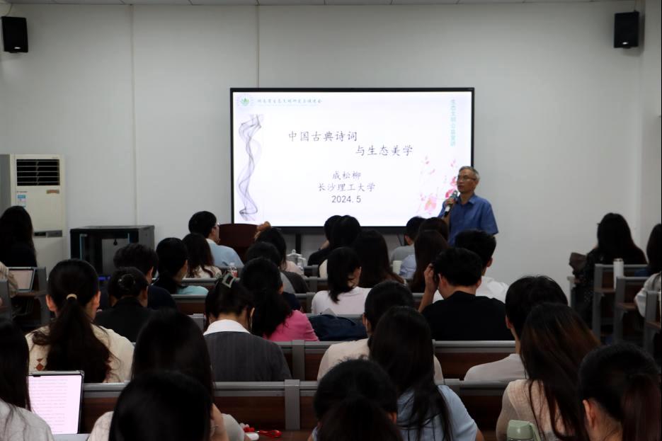 2024年5月21日下午,在线买世界杯平台文新学院通识讲座暨人文素质大讲堂之“中国古典诗词与生态美学”专题讲座在金盆岭校区9教417室举行。湖南省人民政府参事、中文系二级教授成松柳老师为长理师生带来了一场富有人文气息的古典诗词盛宴。成松柳教授首先对“古典诗词生态美学的艺术呈现”进行了阐述。他将中国古典诗词生态美学的呈现方式分为“自然本身的和谐”、“人与自然万物的和谐”、“人与社会的和谐”三个方面,以李白、王维、刘禹锡、张孝祥、朱熹等人的传世诗词为例,围绕“楼观岳阳尽,川迥洞庭开”“相看两不厌,唯有敬亭山”“空山不见人,但闻人语响”“试问西山雨,何如湘水春”进行了诗意解读,详细阐释了“主客一体”“仁爱万物”“江山之助”“天地境界”等观点。成松柳教授提出:中国古代诗歌并非纯粹客观地描摹自然风物,古代文人将浓厚意趣与真挚情感熔铸于自然山水,体现了对自然的审美感知,这种与自然的亲近友好关系承载着博大深沉的生命情怀。