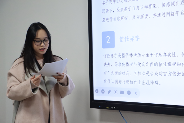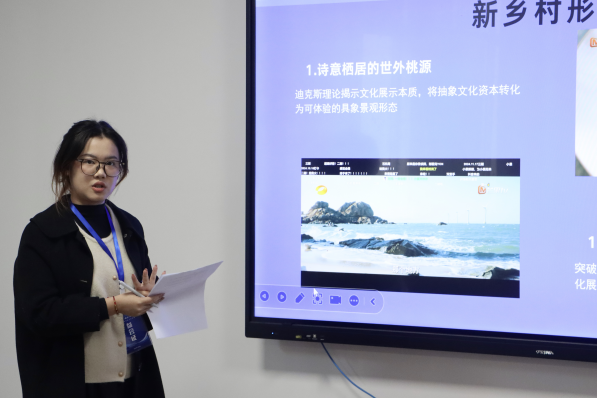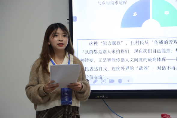 分会场二由吴梦园博士、赵华健博士担任评议人,10位研究生围绕四大研究方向依次汇报学术成果,议题紧密贴合智能时代新闻传播领域的新趋势、新问题。在智能技术与人文传播领域,学子们聚焦技术赋能下的人文发展议题,深入探讨AI技术在传统文化资源活化传播中的应用路径,分析科幻影像中“虚拟场景与现实意义”的辩证关系,尝试构建人机共存语境下的传播美学新路径;在媒介与社会观念建构领域,以媒介实践为切入点,既分析情感类综艺节目对青年婚恋认知的影响,也探究文旅微短剧在乡村形象塑造、文化传播及乡村振兴中的实践价值与优化路径;在主流媒体传播策略领域,紧扣媒体时代使命,梳理《人民日报》“一带一路”主题报道的内容转型与传播创新,同步探讨热点事件传播中的伦理困境,明确主流媒体伦理坚守与舆论引导提升路径;在特定场域传播创新领域,立足场景化传播需求,一方面探索高校意识形态教育传播的内容与形式创新,另一方面聚焦乡村智能传播现状,构建贴合乡村实际的传播模式,助力乡村信息普惠落地。评议老师在总结中肯定了同学们的探索活力和学术热情,同时也针对理论运用不够成熟、研究对象不够聚焦等问题提出建议。