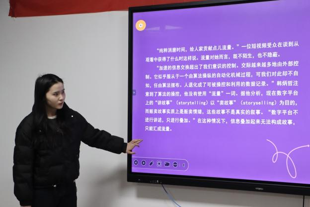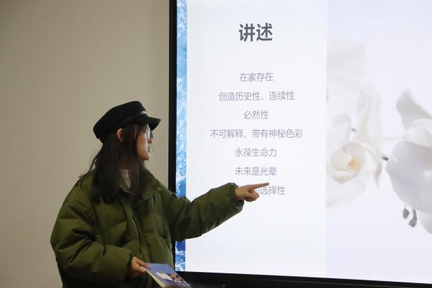 阅读分享环节,吕慧玲同学从讲述与信息的对立、案例分析与思考和叙事回归几个方面生动形象地解释了什么是叙事危机、什么是讲述等方面;聂建洋同学从政治传播的角度分享了政治叙事中的“故事化”;彭佳棋同学以“叙事的力量消逝了吗?”为主题进行读书分享。