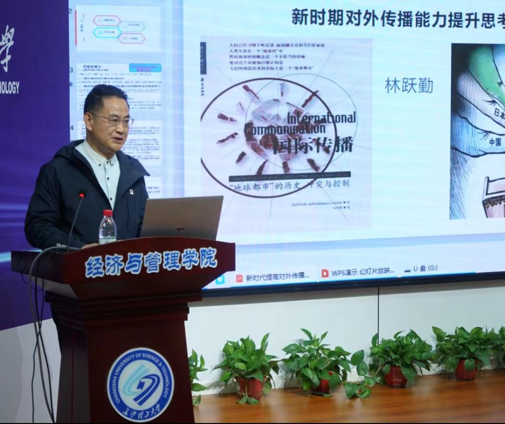 讲座伊始,林跃勤教授通过对当前国际形势的分析,引出“国家综合实力由什么构成?国家在国际舞台的形象和影响力源于何处?改善国际形象、提升国际话语权和影响力有何意义?”等四个问题。重点围绕国际传播能力展开论述。并将国际传播能力基本构成分为机制政策保障、媒体机构实力、传播影响力三个部分。