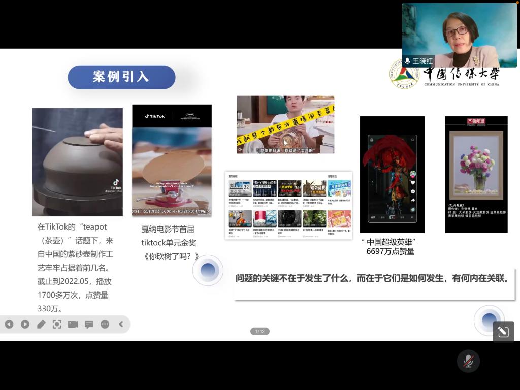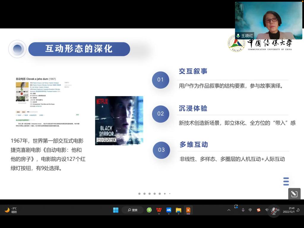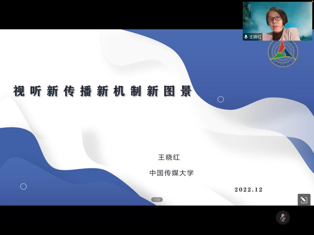 2022年12月1日晚,第十四届研究生云影讲坛文学与新闻传播学院分论坛第五期如期举行。中国传媒大学本科生院院长王晓红教授应邀为世界杯官网师生开展主题为“视听新传播新机制新图景”的讲座。本次讲座以线上的方式进行,院长刘建新教授担任主持,赵继光老师、陈健强老师参与讲座。