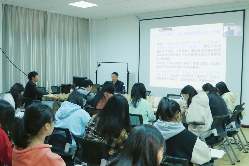2022年10月8日上午9点,在线买世界杯平台第十八届研究生博力学术论坛文新学院分论坛第三期于金盆岭校区7教306举行。广州大学人文学院纪德君教授为我院师生开展了主题为“口头传统规约下的小说叙事——以《水浒传》为中心”的讲座。此次讲座线上线下同步举行,引起了我院师生的广泛关注。文新学院党委委员郑劭荣教授担任讲座主持人,中文系华德柱副教授、王福雅副教授、周静副教授、王莉老师、向双霞老师等出席了本次讲座。22级中文研究生及22级汉语言文学本科生全体参与听讲。