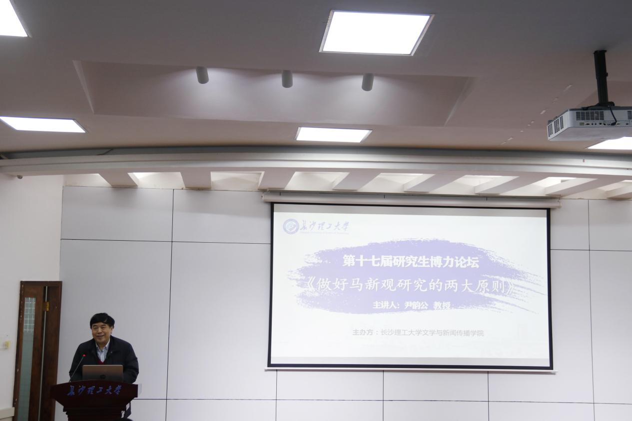 2021年10月25日下午,湖南师范大学新闻传播学院院长尹韵公教授做客在线买世界杯平台第十七届研究生博力学术论坛,为我院师生带来主题为“做好马新观研究的两大原则”的讲座,本次讲座由在线买世界杯平台文学与新闻传播学院院长刘建新主持,文学与新闻传播学院党委书记伍接朝、副院长周云鹏、副院长魏桃初、副院长耿蕊、新闻专业老师、全体新闻研究生参加及部分本科生参加。