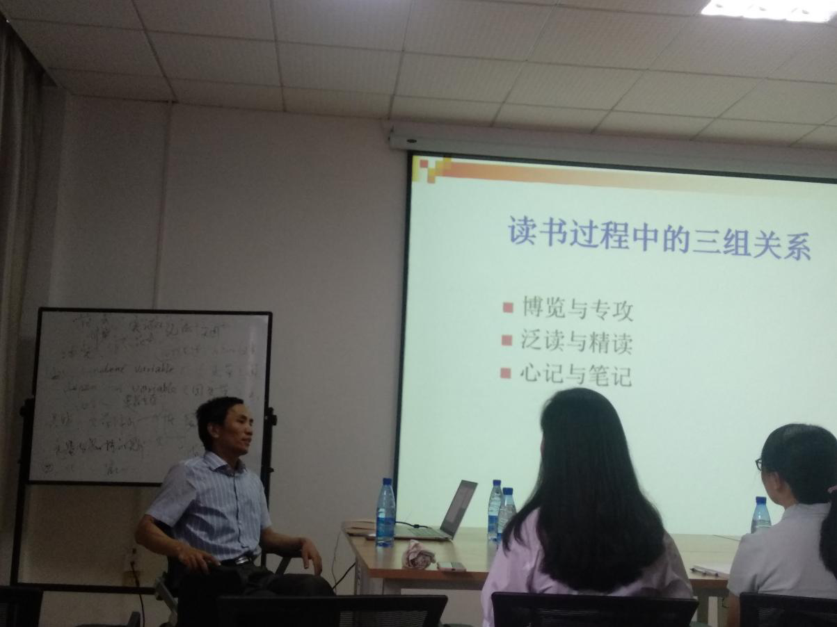 胡海义教授指出,博览与专攻是辩证统一的、相辅相成的,在研究生初始学习阶段,不论是由博览群书到找到专攻的方向,还是从专攻由小及大的扩大知识面米娜,都是可取的路径。随后,胡海义教授强调,泛读应该从目录学入手,并以鲁迅、陈垣、程千帆等人的话进行了深入论证;在介绍精读的方法时,胡海义教授又向同学们介绍了点读、抄写等方法。最后,在心记与笔记一节中,胡海义教授引用了胡适的读书“四到”原则,强调了读书专注的重要性。