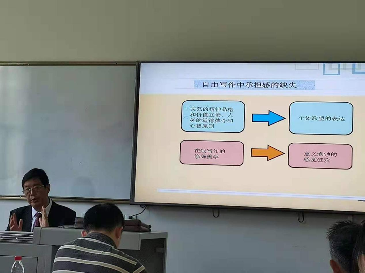 报告尾声,参与讲座的老师与同学就有关问题与欧阳友权教授作了简短而不失深入的学术交流与讨论。在一番愉快的交流之后,易彬教授作了总结发言,就欧阳友权教授讲座中的精彩内容进行了点评,并告诫在座各位研究生同学在学术研究与生活工作中需要秉持的方法与态度。