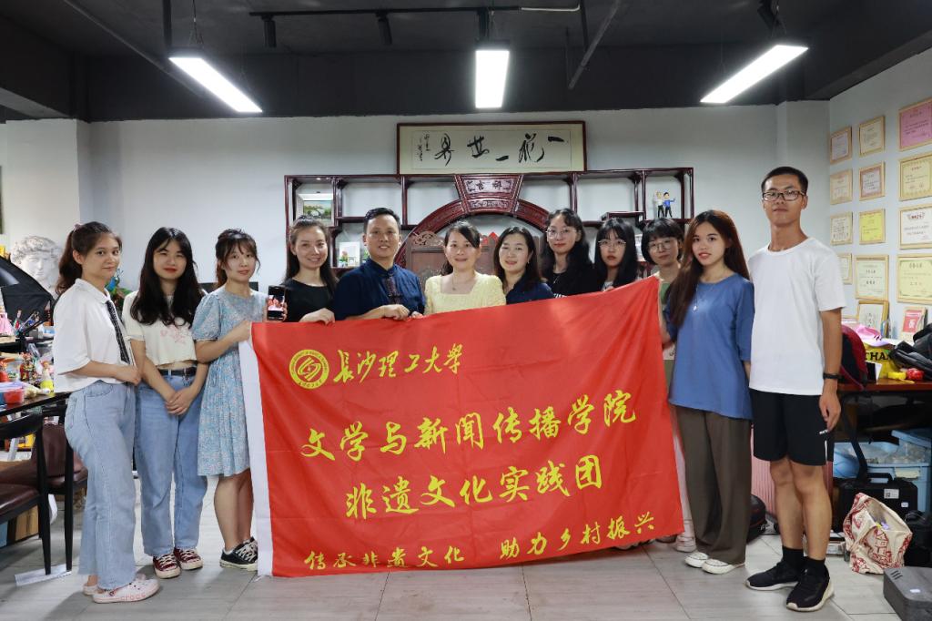 弘扬非遗文化,传承艺术匠心,让当代大学生零距离感悟中国非遗艺术的魅力与非遗文化传承人的匠心精神。7月26日,在线买世界杯平台文学与新闻传播学院党委副书记刘莎、新闻系副教授戴钰带领非遗文化实践团8位学生来到创谷长沙市天心区文化广告产业园开展非遗文化实践调研。
