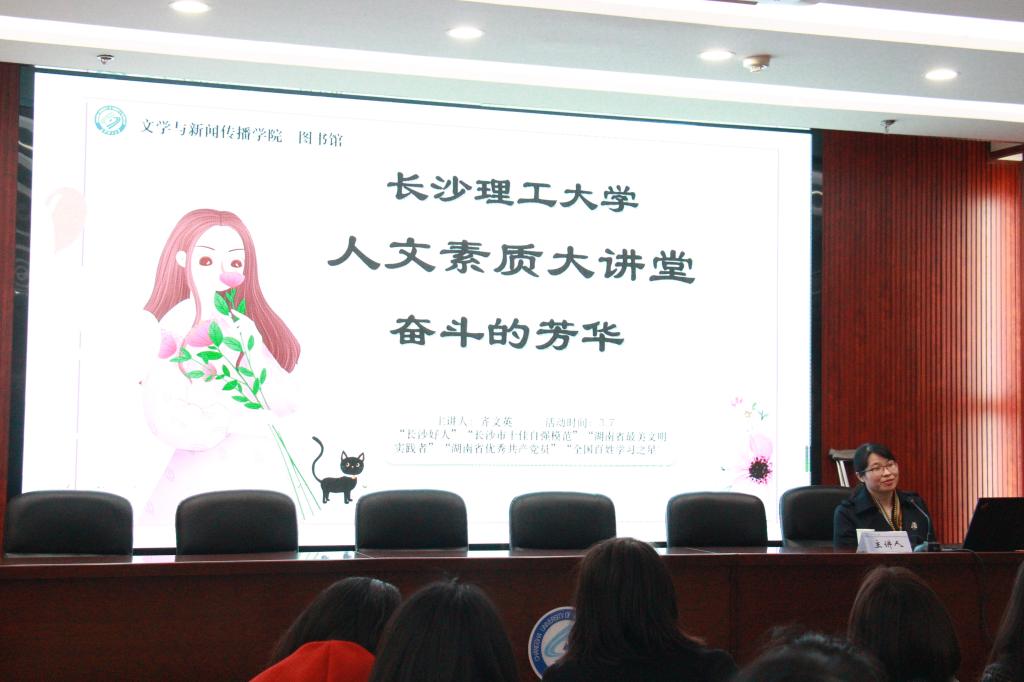 本次人文素质大讲堂由优秀校友齐文英女士主讲,面向全校所有学生开展,活动特意选在3月7日女生节这一天开展,旨在激励女生们能在青春年华之时面对挫折不放弃、提升自我同时不忘回报社会,做到自尊自爱、自立自强。通过与齐文英的交流互动,同学们更强烈地感受了青春奋斗的意义,也认识到什么样的女生才能被称作是真正的“女神”。