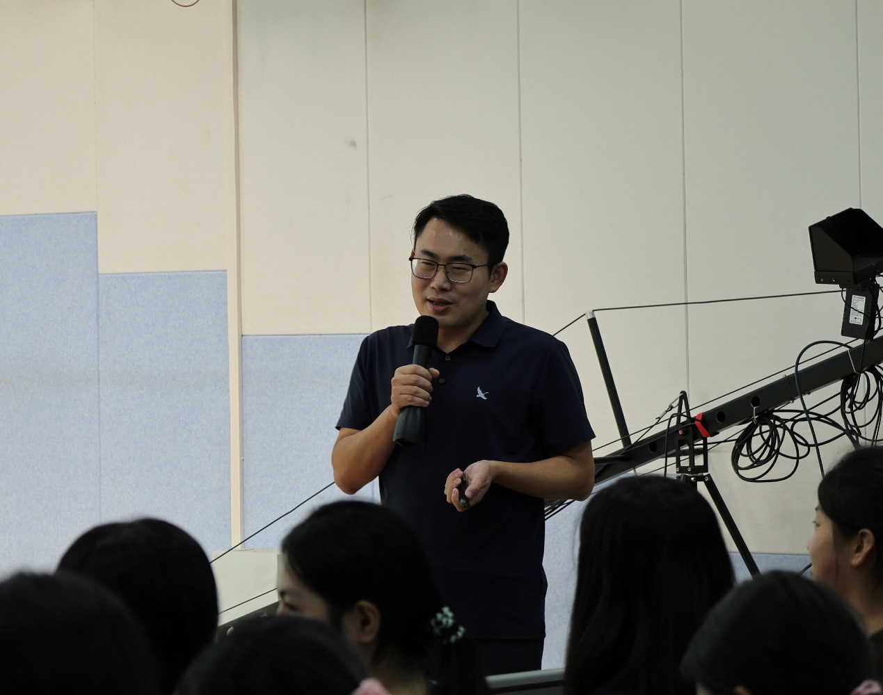 “腹有诗书气自华”的秦红玉老师率先开讲。针对问卷星中提出的“在短视频刷屏的时代,怎样才能做到静心阅读”,她给出“三步法”:从自己真正感兴趣的内容入手,把书中内容进行拆分,一边记录一边消化。对于同学们感到焦虑的“文科就业难”现状,她一句定调:“可以焦虑,别被困住。”要守住对文学的热爱,坚信“天生我材必有用”,用四年时间把实力攒厚,这样就能打破壁垒、创造机遇。谈到大一新生的适应问题,她给出“最低成本攻略”:上好每一节必修课,跟紧老师的节奏,主动探索兴趣方向。