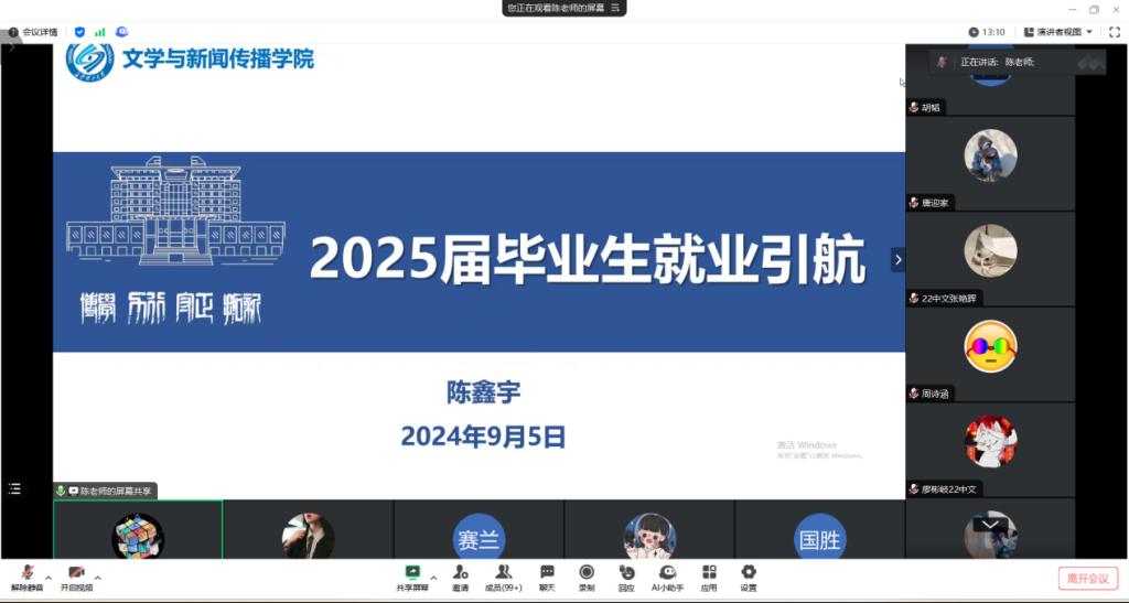 为进一步提高学院就业指导工作质量引导毕业生了解就业形势,树立正确的就业价值观,积极就业,理性择业,我9月5日晚腾讯会议线上召开2025届毕业生就业引航大会。会议由学生党总支副书记、2025届就业专干陈鑫宇主持,全体2025届毕业生参加此次线上会议。