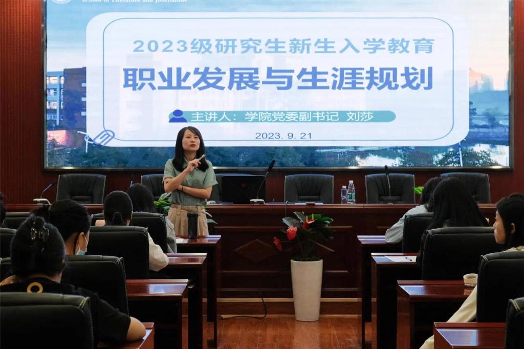 921日下午,文新学院在金盆岭校区九教218报告厅举行23级研究生新生入学教育“职业发展与生涯规划,文新学院党委副书记刘莎任主讲人23级全体研究生参加