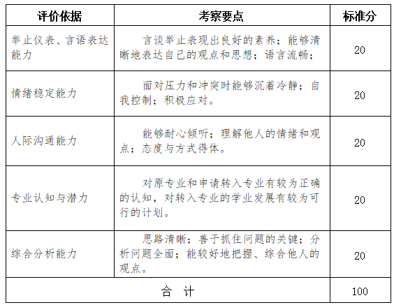 申请转入我院汉语言文学专业、新闻学专业、网络与新媒体专业的学生均须参加面试。面试评分标准如表2所示。