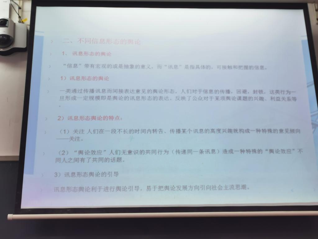 在讲座上,魏老师主要向同学们介绍了不同视角下的舆论形成研究、舆论形成的影响因素和舆论形成的过程。同时他运用新冠肺炎时期的舆论形成、天津大学教授学术造假等例子,更好地帮助同学们理解舆论形成的完整过程。在讲座上同学们与魏老师形成良好的互动,积极与魏老师就当下热点事件进行了深度的交流。