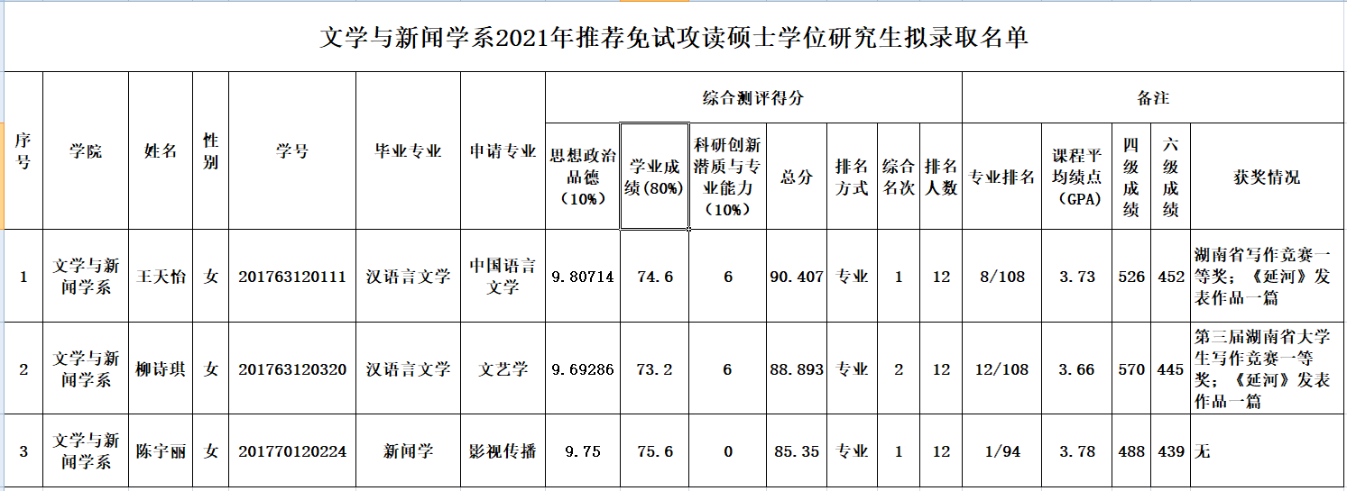 根据《在线买世界杯平台关于做好2021年推荐优秀应届本科毕业生免试攻读研究生工作的通知》要求和《文新系2021年推免生工作实施方案》,严格按照工作程序,经学生自愿申请,遴选与审核鉴定,系推免工作小组面试审核,拟确定推荐以下3名同学为2021年免试攻读硕士学位研究生,现予以公示,公示期为9月26日至28日,如有异议,请向系教务办反映,电话85256150。