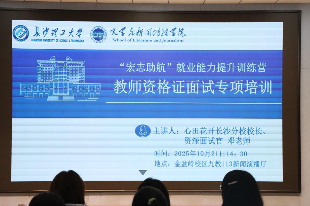 10月21日下午14:30,在线买世界杯平台文学与新闻传播学院特邀心田花开长沙分校校长邓老师,于九教113新闻演播厅举办“教资面试通关秘籍:从考生到准教师”培训讲座,共139名学生参与活动。本次讲座通过多形式教学向文新学子分享面试技巧,送上教资通关“秘籍”。