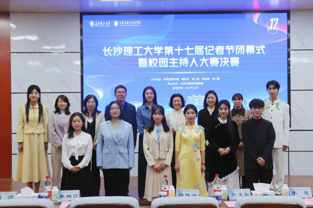 2025年12月19日19:00,由校党委宣传部、教务处、学工部、校团委、研工部主办,文学与新闻传播学院承办的在线买世界杯平台第十七届记者节闭幕式暨校园主持人大赛决赛在金盆岭校区四号教学楼108学术报告厅举行。山东广播电视台主持人彭文馨,湖南省朗诵艺术协会支部书记、全国“读书成才女职工”获得者李慧,校团委副书记(主持工作)陈璐莎,校学生工作部副部长陶传谱,校图书馆副研究馆员、国家汉办语合中心国际汉语教师、湖南省语委普通话测试员张雪梅,文新学院新闻系副教授、湖南省高校教学能手曾志华,文新学院党委副书记刘莎出席本次活动并担任评委。