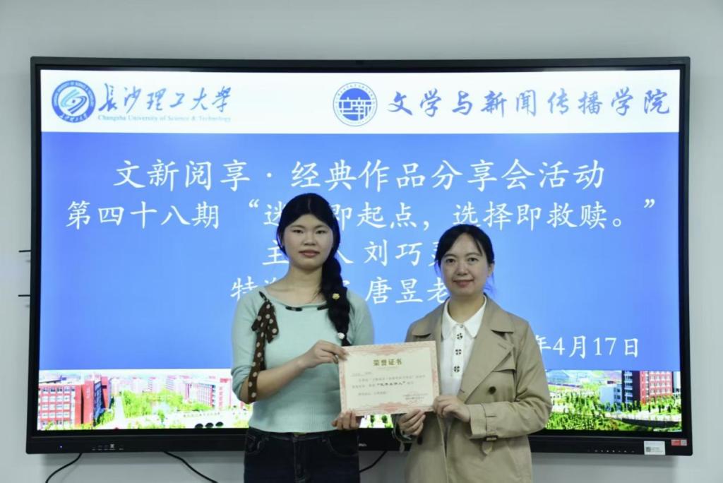 4月17日晚19:30,文新学院第四十八期“文新阅享・经典作品分享会”在金盆岭校区九教223团体成长辅导室顺利举办。本期活动由汉语言2401班刘巧灵主讲,以“迷茫即起点,选择即救赎”为主题,与同学们共读日本作家东野圭吾作品《解忧杂货店》。中文系唐昱老师作为本次分享会的特邀嘉宾参与活动。